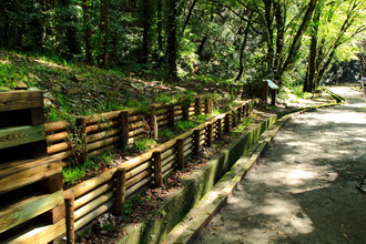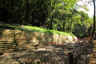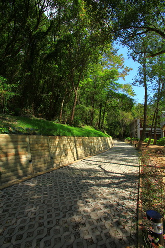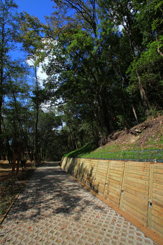 木格框擋土牆、木飾擋土牆暨排水溝、木構擋土牆、陰井、地下洩井、導覽牌、植草磚修復、灌木種植。 |