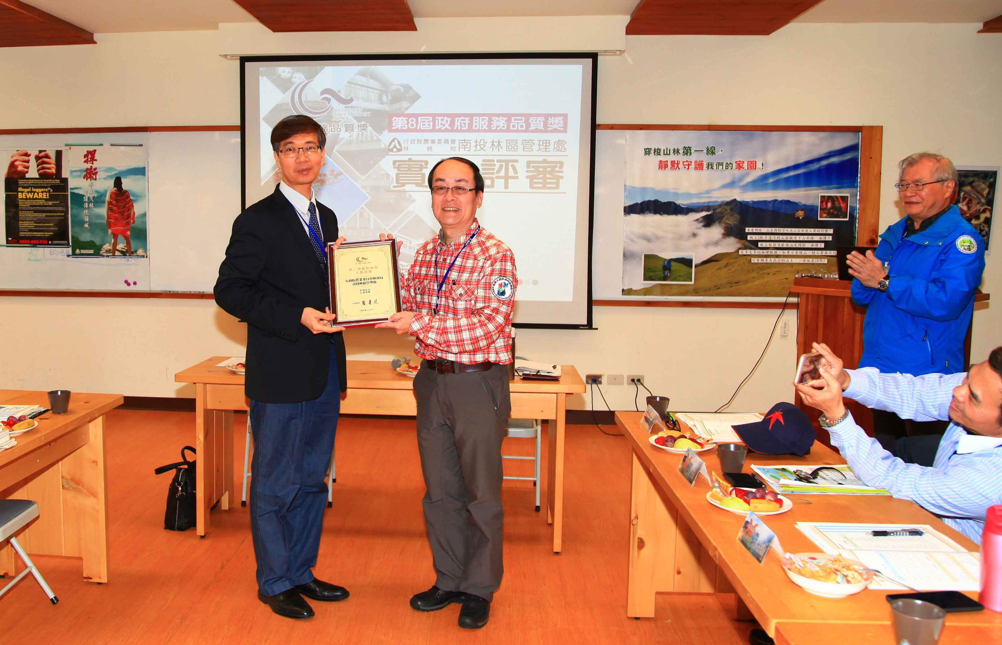 本處參加「第8屆政府服務品質獎」參獎作業,榮獲農委會評選為特優,並薦送行政院國家發展委員會評獎,獲得入圍肯定。國發會評審委員於105年3月28日至本機關經營之奧萬大國家森林遊樂區進行工作現場實地評審,並頒發入圍獎狀,由張處長岱代表領獎。