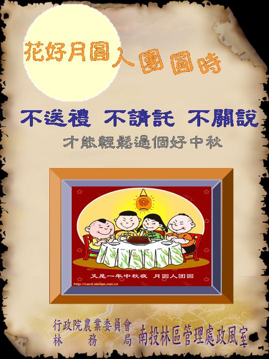 中秋佳節將屆,南投分署特別籲請全體公務同仁恪遵「公務員廉政倫理規範」相關規定,對於職務上有利害關係者所為之餽贈或邀宴應予以拒絕,並落實簽報登錄建檔程序。 依據「公務員廉政倫理規範」第四點規定,公務員不得要求、期約或收受與其職務有利害關係者餽贈財物。但如受贈之財物市價在新臺幣五百元以下,且係偶發而無影響特定權利義務之虞時,得受贈之。惟如餽贈財物超過前開金額,則應依本規範規定,予以拒絕或退還,並簽報長官及知會政風室。至於飲宴應酬部分,依據該倫理規範規定,公務員不得參加與其職務有利害關係者之飲宴應酬。但如係因公務禮儀確有必要,則應依規定簽報長官核准,並知會政風室後始得參加。 為使同仁能對「公務員廉政倫理規範」有更一進步之認識,公務人力發展中心之「e等公務員」網站及地方研習中心之「e學中心」網站建置有「公務員廉政倫理規範簡介」影音線上課程及動畫數位學習課程,歡迎同仁踴躍上網學習。 南投分署力行行政革新,建立廉能政府之政策,特別提醒同仁務必遵守「公務員廉政倫理規範」規定,確實做到「不隨便收受禮物」及「不任意參加飲宴應酬」之目標。