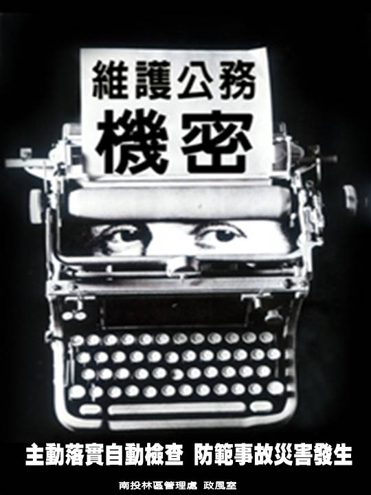 多一分謹慎小心,多一分安全保障。 資料不亂放,處處勤上鎖,隨時謹言行,機密不外洩。 洩密危害生於疏忽,保防成功在於預防。 養成文書保密習慣,防止公文機密外洩。 非我掌管的公務機密不過問,是我經手的公務機密要保守。
