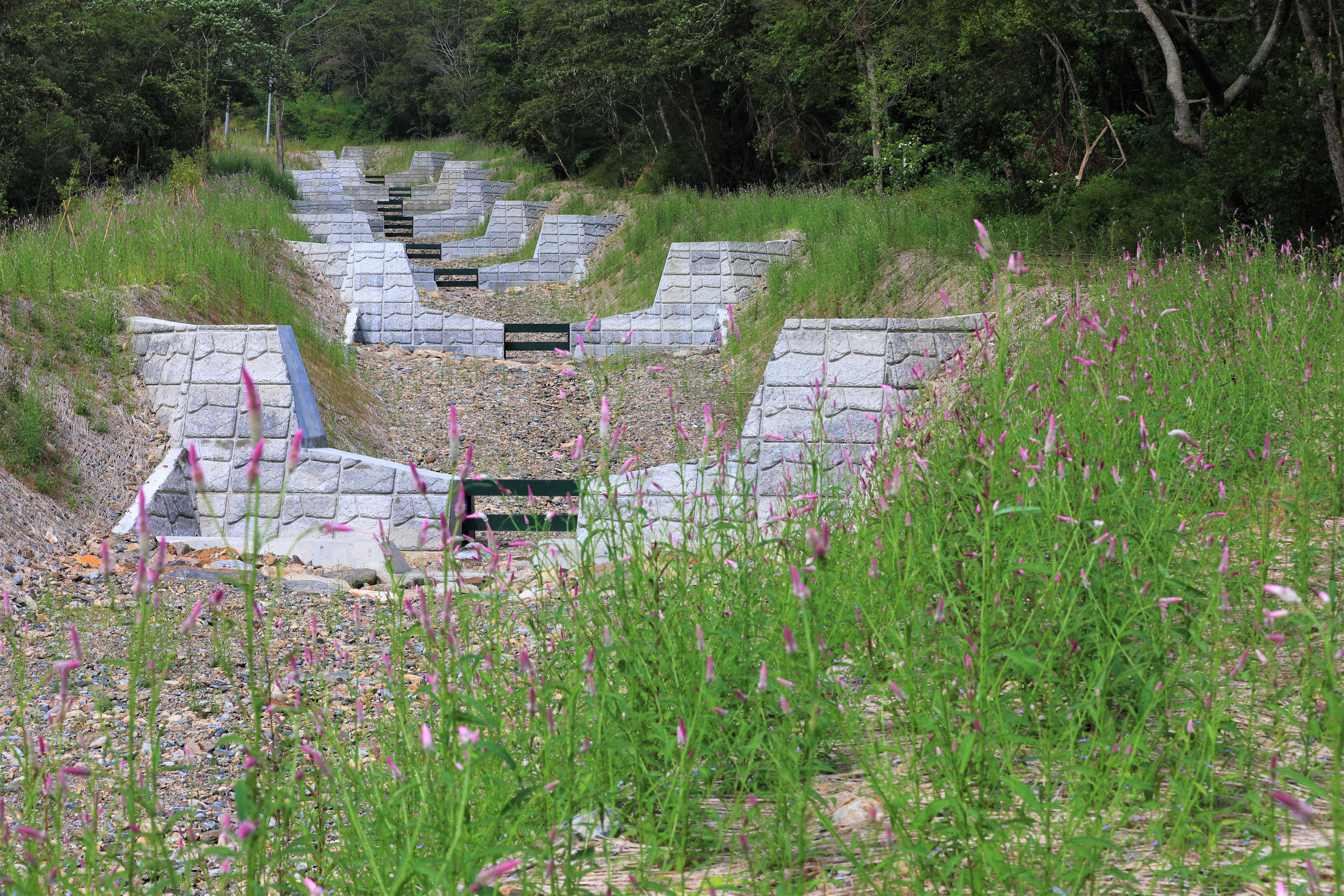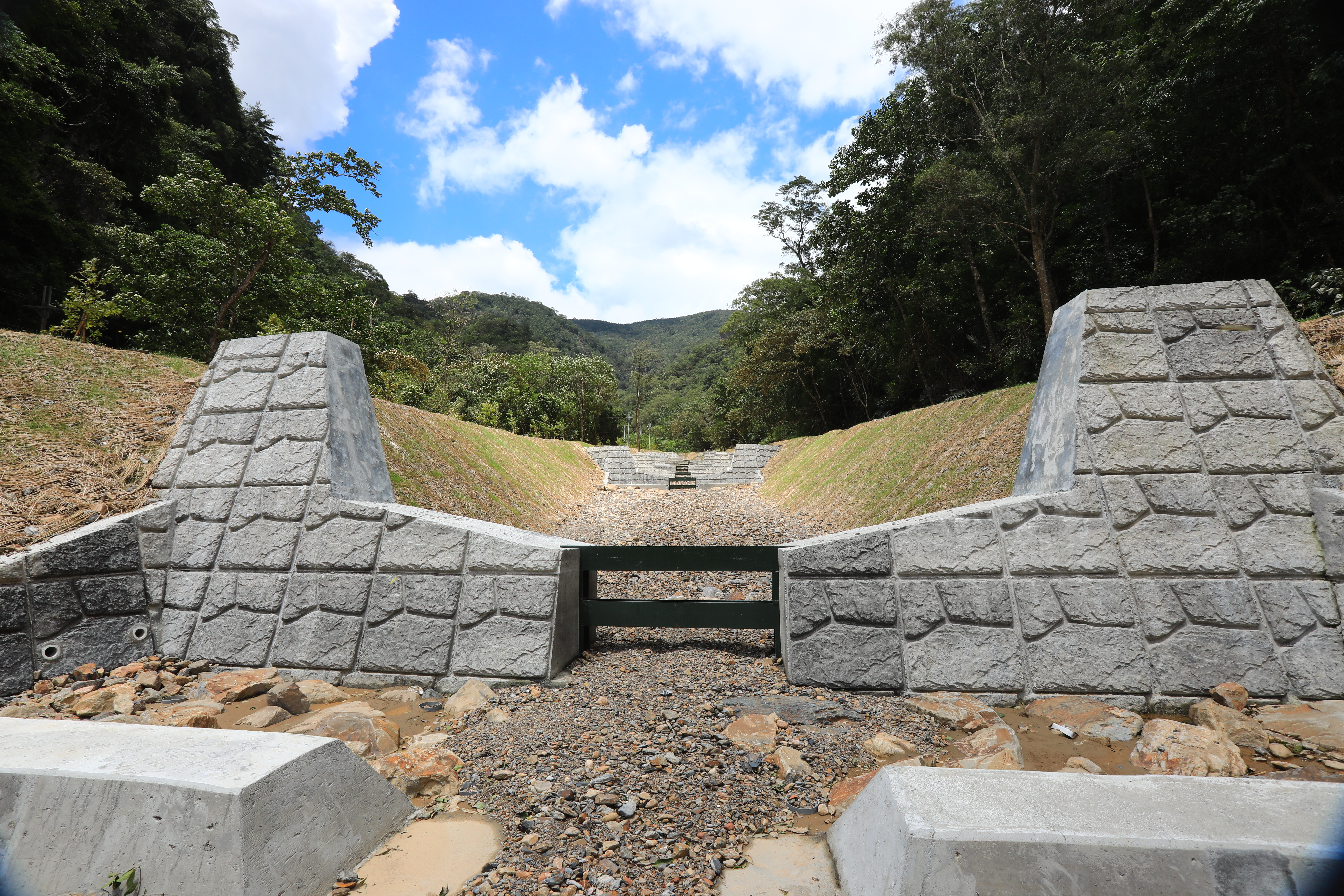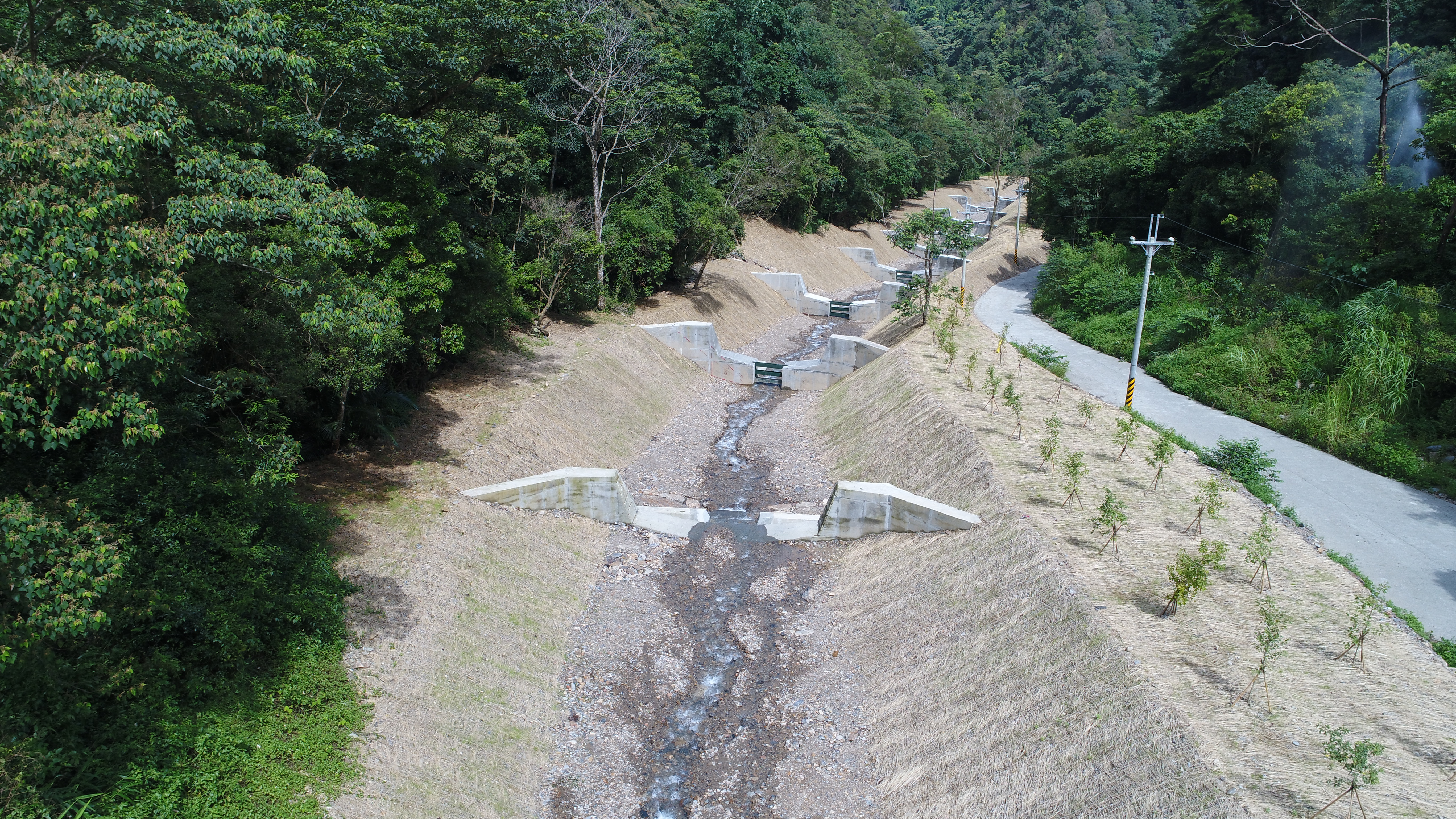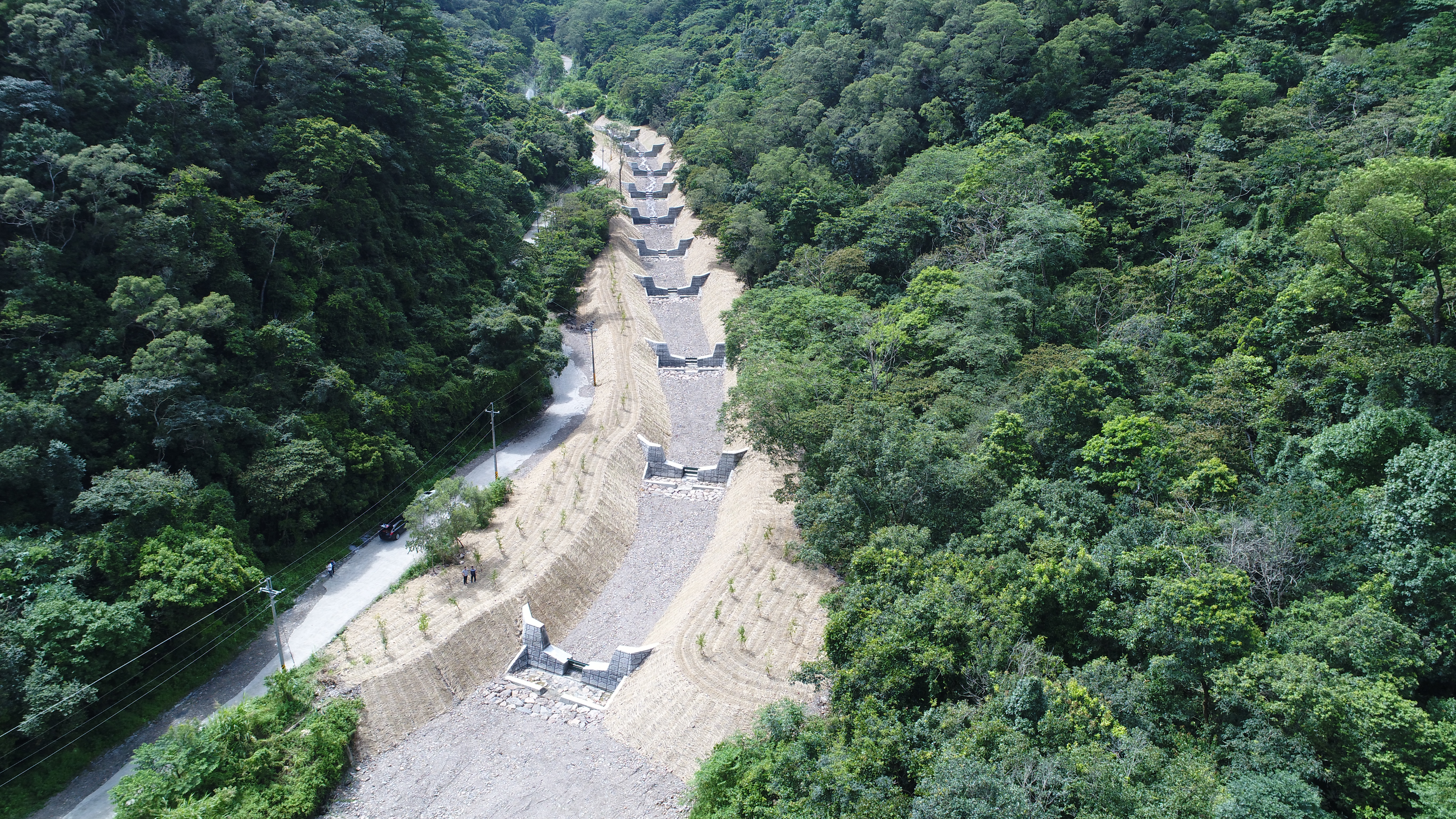 主辦單位 農業部林業及自然保育署南投分署 監造單位 農業部林業及自然保育署南投分署 施工單位 宇正營造有限公司 工程地點 位於南投縣埔里鎮埔里事業區109林班。 工程緣起 本案因106年6月2日豪雨造成本分署109林班上游坡地崩塌,洪水沖毀既有護岸,土砂堆積河道造成災情,本案基於分年分期,去年(107)先針對下游具立即保全對象進行治理,今年延續對中游做土砂控制工程。 工法簡介 本工程由本分署挑戰自辦測量、設計及監造工作,跳脫傳統治理工程,以系列潛壩為骨,壩間回填土為肉,具軟硬兼俱之治山工程。壩間以緩坡修坡作為動物自然通道,除確保治理成效外兼顧生態的合諧。 本工程設計壩翼上折角45度,可收納入射角45度以內之外溢洪水,壩翼基礎一體成型,並配置鋼筋加強,以抵坑洪水衝撞。 本工程採骨幹治理造價約傳統工法的1/3。本工程整治長度約375m,治理經費約可節省約1650萬元。 得獎事蹟 108年度優良農業建設工程獎-治山防災類-佳作獎