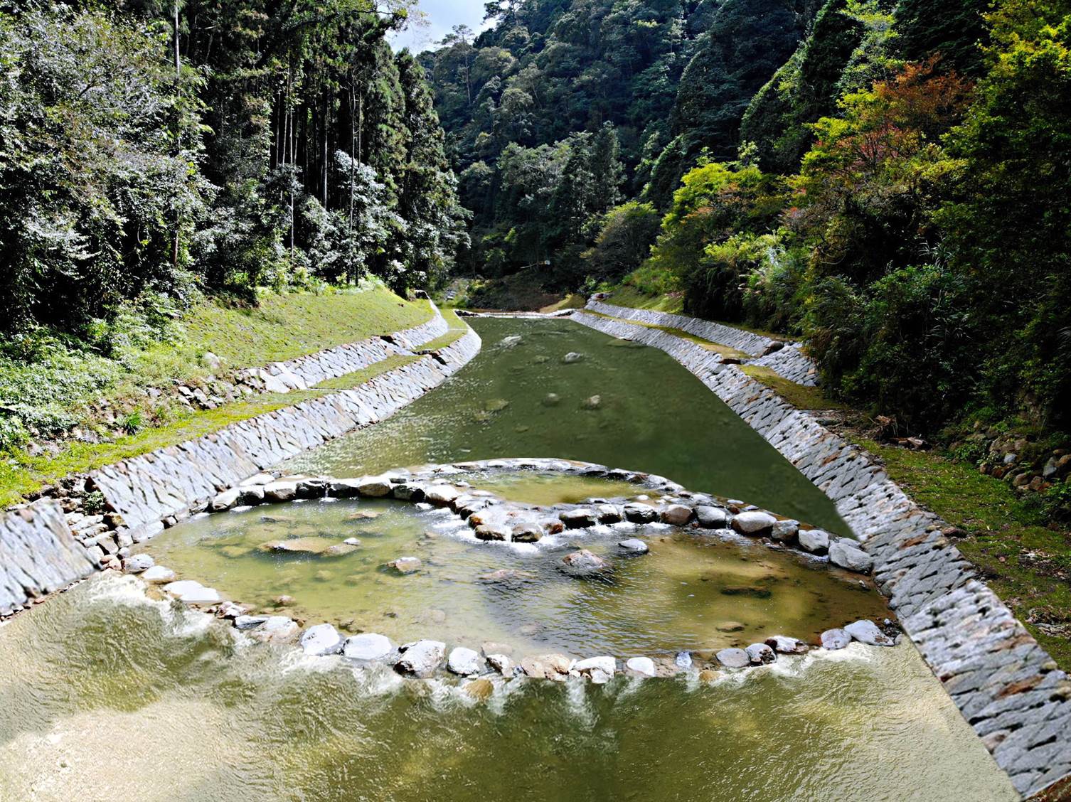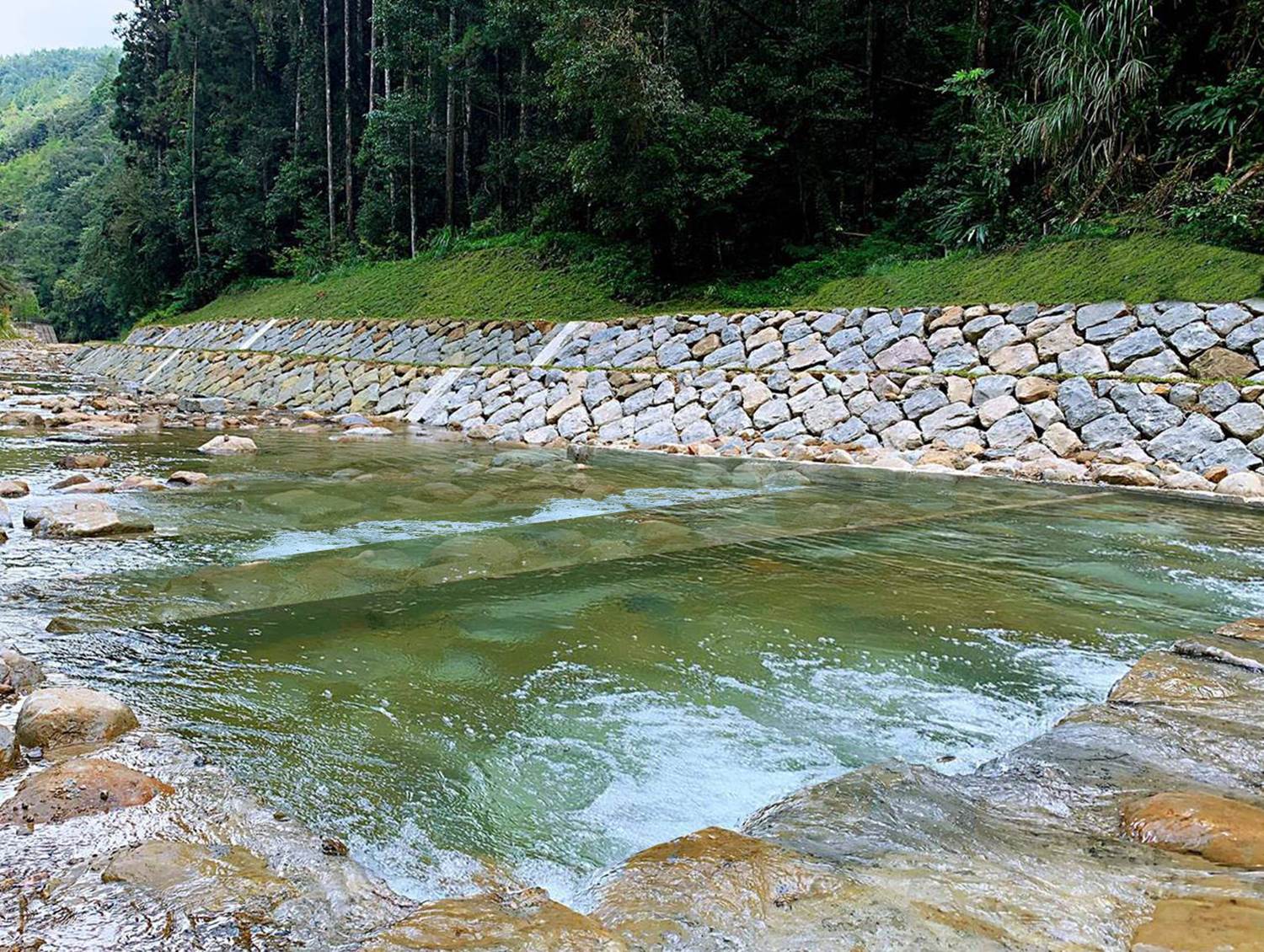 砌石固床工共5座、隔牆8處、生物通道2處、砌石護岸長162公尺、護岸(含木格框護坡)長32.7公尺、河道清疏整理。 |