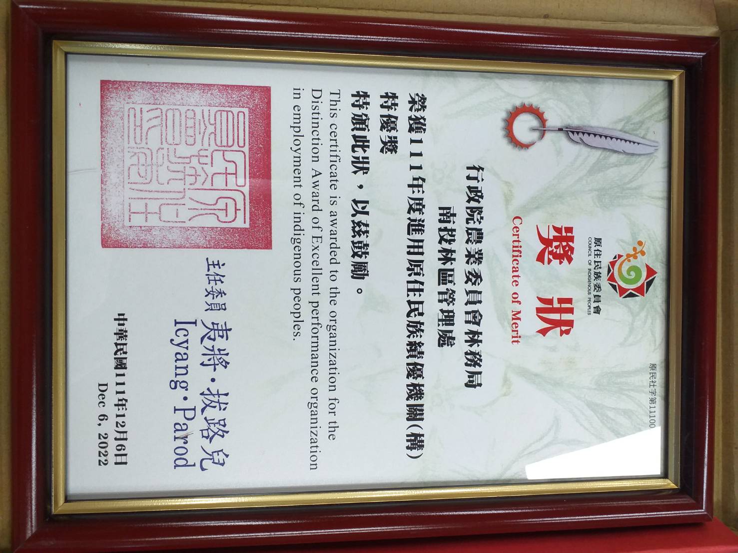 本機關榮獲原住民族委員會111年度進用原住民績優機關特優獎