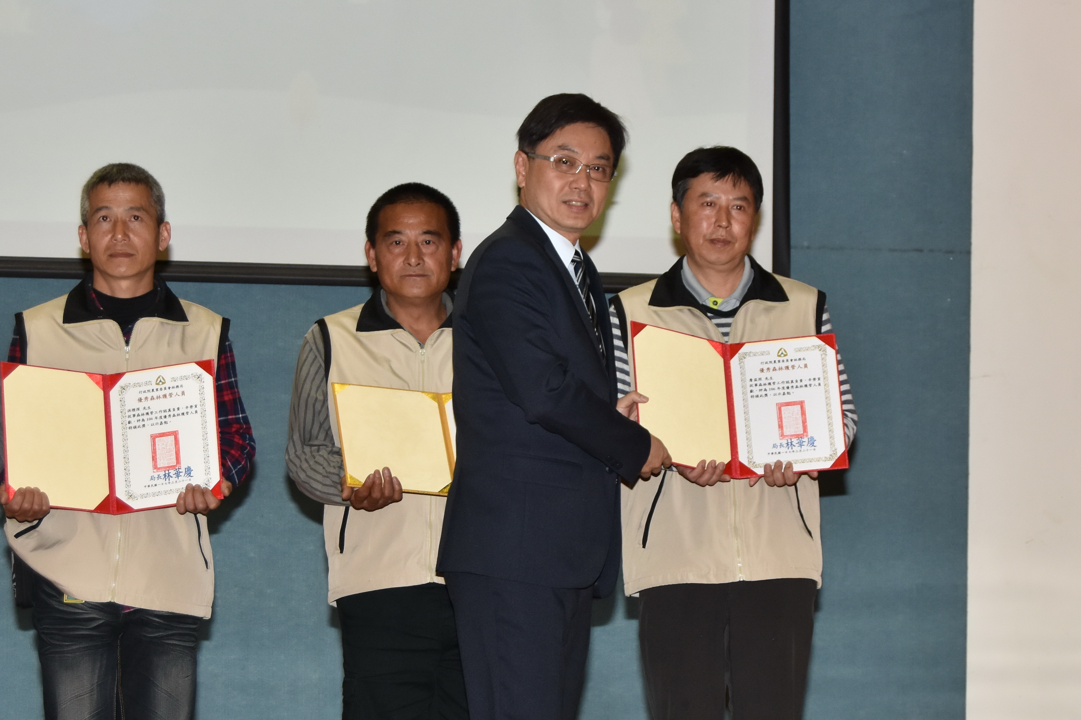 林務局南投林區管理處暨企業工會於本(107)年5月1日上午9時舉行107年度五一勞動節慶祝大會,並依規定辦理「勞工安全衛生講習」以宣導正確工安防護及災害預防的觀念,會中表揚模範勞工、優秀森林護管人員及優秀企業工會會員計27名,每名各獲頒獎狀及禮券。 林管處處長李炎壽特別於會中感謝受表揚同仁平日的辛勤及付出,勉勵繼續努力,一同守護這片美麗的山林。李處長亦表示,受表揚人員只是一個代表,全處各項業務在團隊和諧合作下共同完成工作目標,並締造佳績,所有員工之努力都值得嘉許及肯定。